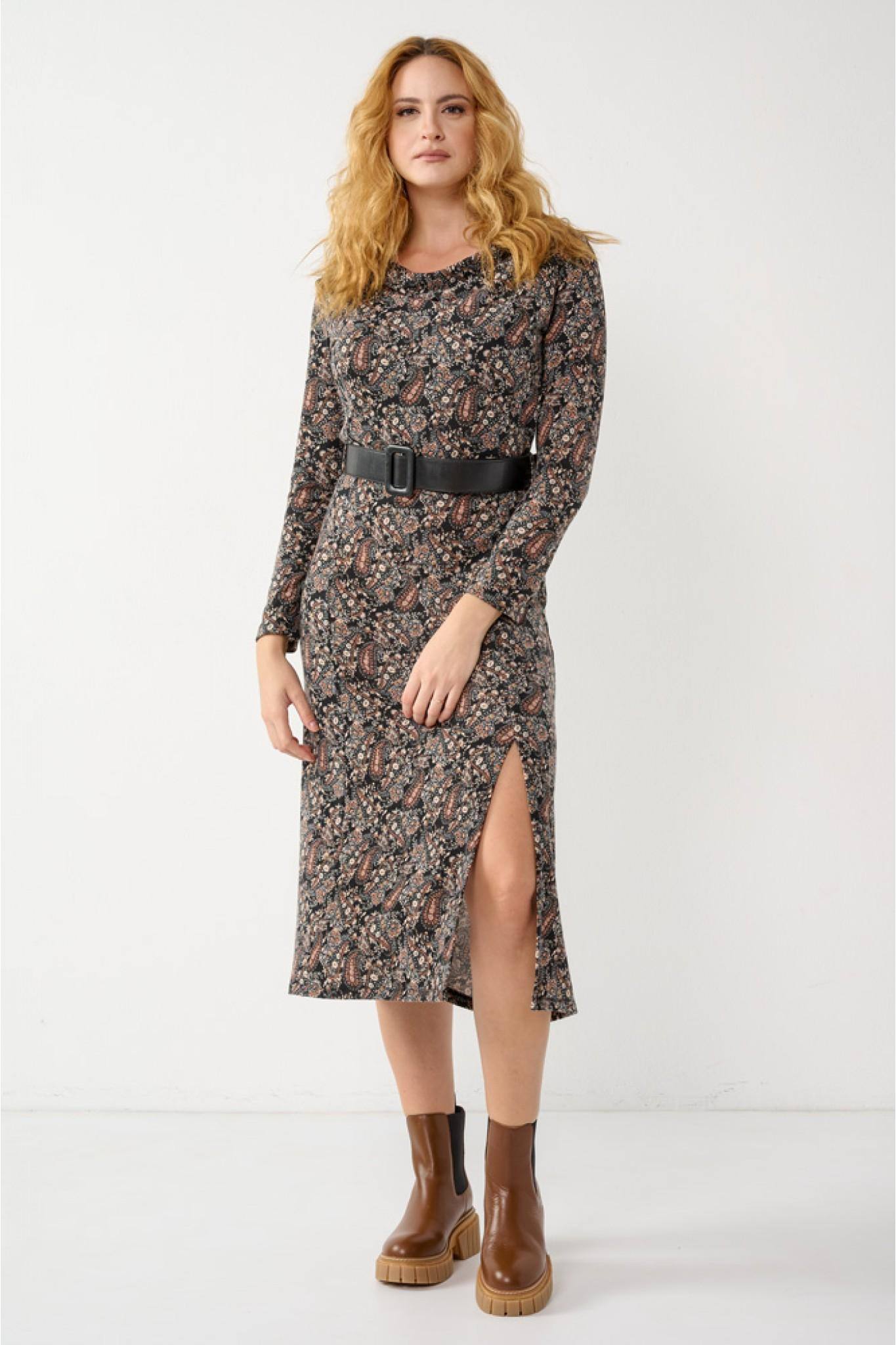 Φόρεμα εμπριμέ πλεκτό με ντραπέ λαιμόκοψη. Έχει ανοιγμα εμπρός αριστερά κάτω από το γόνατο.