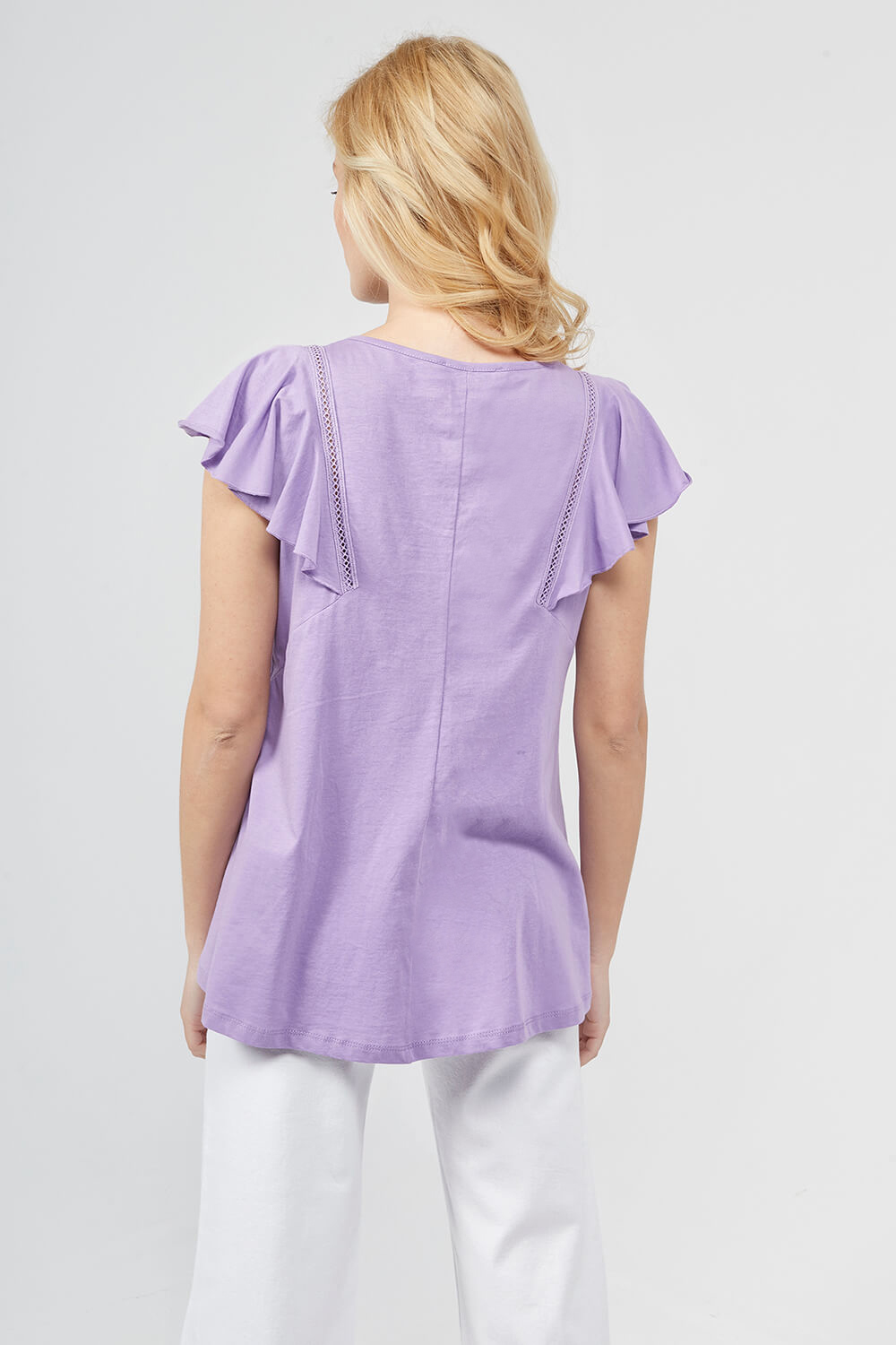 Κοντομάνικη λιλά μπλούζα με βολάν και δαντέλα στους ώμους.