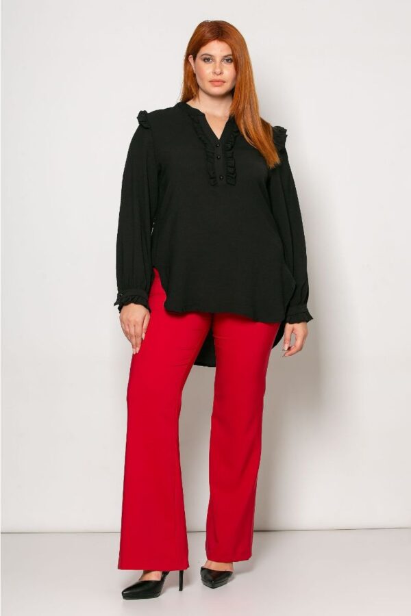 Μπροστά έχει V λαιμόκοψη με λεπτομέρειες βολάν και 3 κουμπιά που ανοίγουν.
